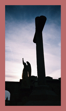 鬱々としたオフィスがある洞窟まがいの建物は・・・天使の像や十字架がひしめくプエブロ・ヌエボの墓地裏にあるので、遠目だと、建物の輪郭が、地平線にシルエットをなす霊廟群と見分けがつかない。その地平線をつき刺すように、無数の煙突や工場がならび、バルセロナの上空に、緋色と黒の黄昏を永遠につむいでいた。
